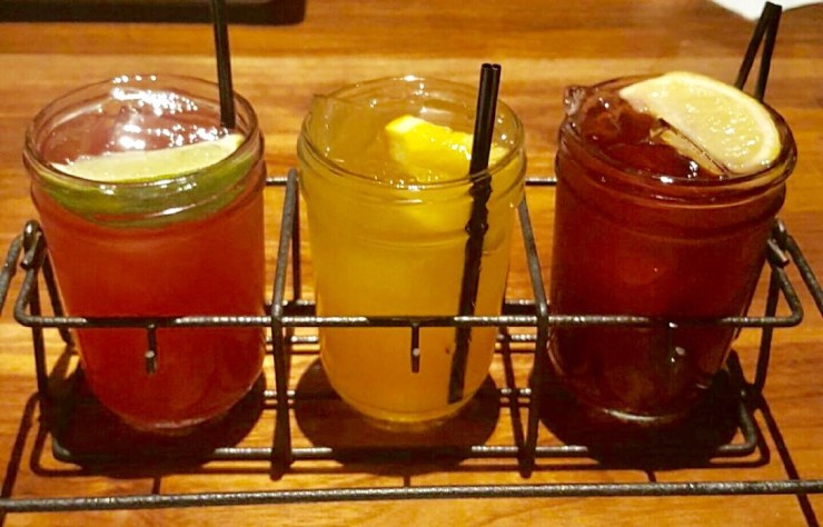 We also tried the Sangria sampler featuring (left to right) Red Moscato Sangria, White Peach Sangria, and Pomegranate Red Sangria. We both agreed that the Pomegranate Red was our favorite, but I also really enjoyed the strong peach flavor in the White Peach Sangria. You can’t go wrong with any of these three, especially on a warm patio day.