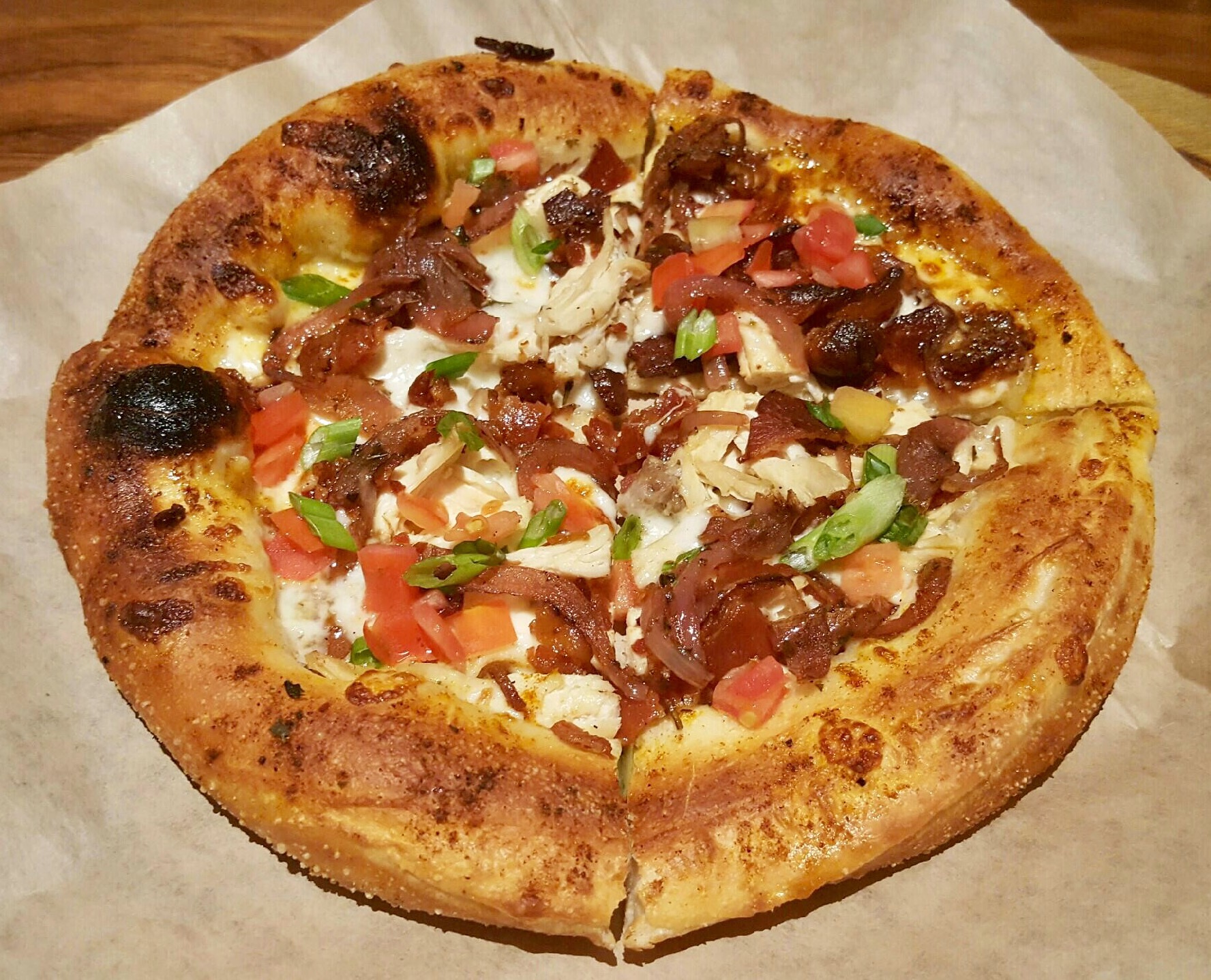 You can choose any mini brick oven pizza on the menu for $7. We choose the Black and Bleu. This (not so mini) pizza features cajun chicken breast, hickory-smoked bacon, mozzarella cheese, caramelized onions, blue cheese crumbles, fresh tomatoes & greens onions. This would have been enough for a full meal for either of us alone.