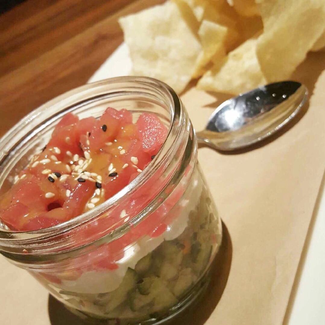 I’m a huge sushi lover, so I wanted to try the Ahi Poke Jar first. This was a very generous portion at $8, filled with layers of Ahi tuna in a sesame peanut vinaigrette, avocado, cucumber salad, and wasabi dressing with a side of wonton chips. This app is delicious and light, so if you’re looking for something a little more diet friendly, this is a great option.