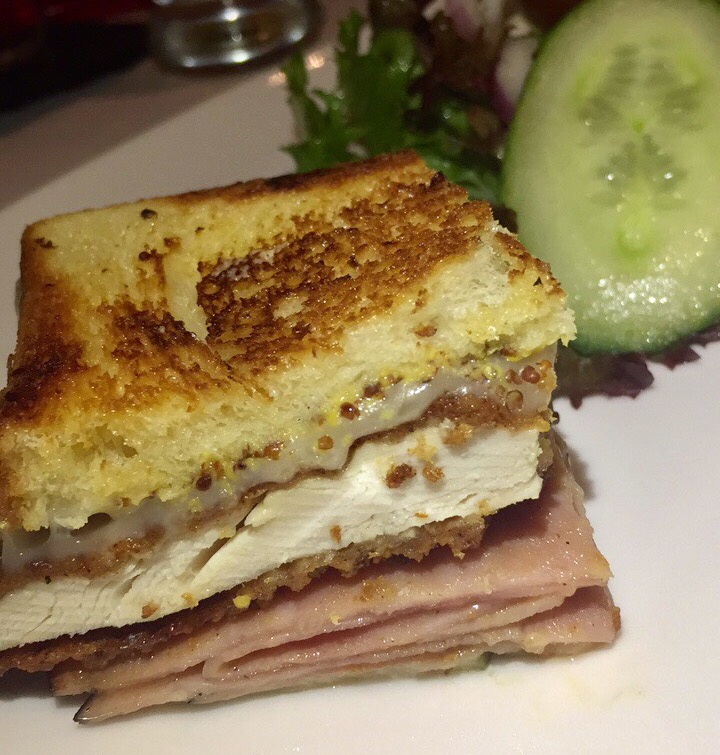 We got to try one item off of the Hand Helds menu section, the Chicken Melt. This was my favorite item that we sampled. It seems pretty simple; a fried chicken breast, sliced smoked ham, dill pickles, Swiss cheese and ground mustard on French brioche, but it was incredible. The sandwich was filling, cheesy, and the fried chicken was perfectly cooked. While I was getting down on the sandwiches, my friend devoured not only her salad, but mine too. Apparently the salad it comes with is pretty tasty because Nicole was about to eat the salad off our neighbors’ plate as well.