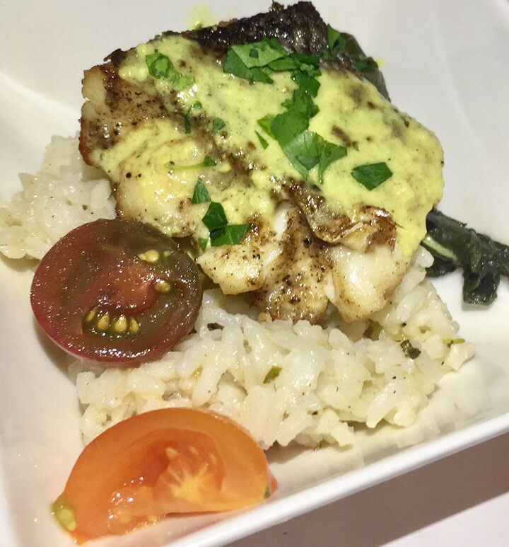 First up was a pan seared striped bass. This dish is a hearty combo of Texas fresh bass fillet topped with yellow coconut curry sauce on a bed of spicy sautéed Swiss chard and basmati rice with fresh tomato salad. The fish was very mild, and the spicy swiss chard added a nice touch to the meal.