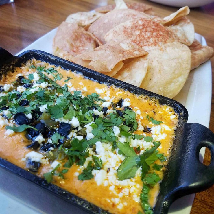We also tried the Queso Dip. It’s more than just a regular cup of queso, made with jack cheddar, queso blanco, pickled jalapeños, pimentos, cilantro, and black beans, and it’s served with hand-cut tortilla chips. This was a unique and delicious queso, with a bit of a spicy kick.