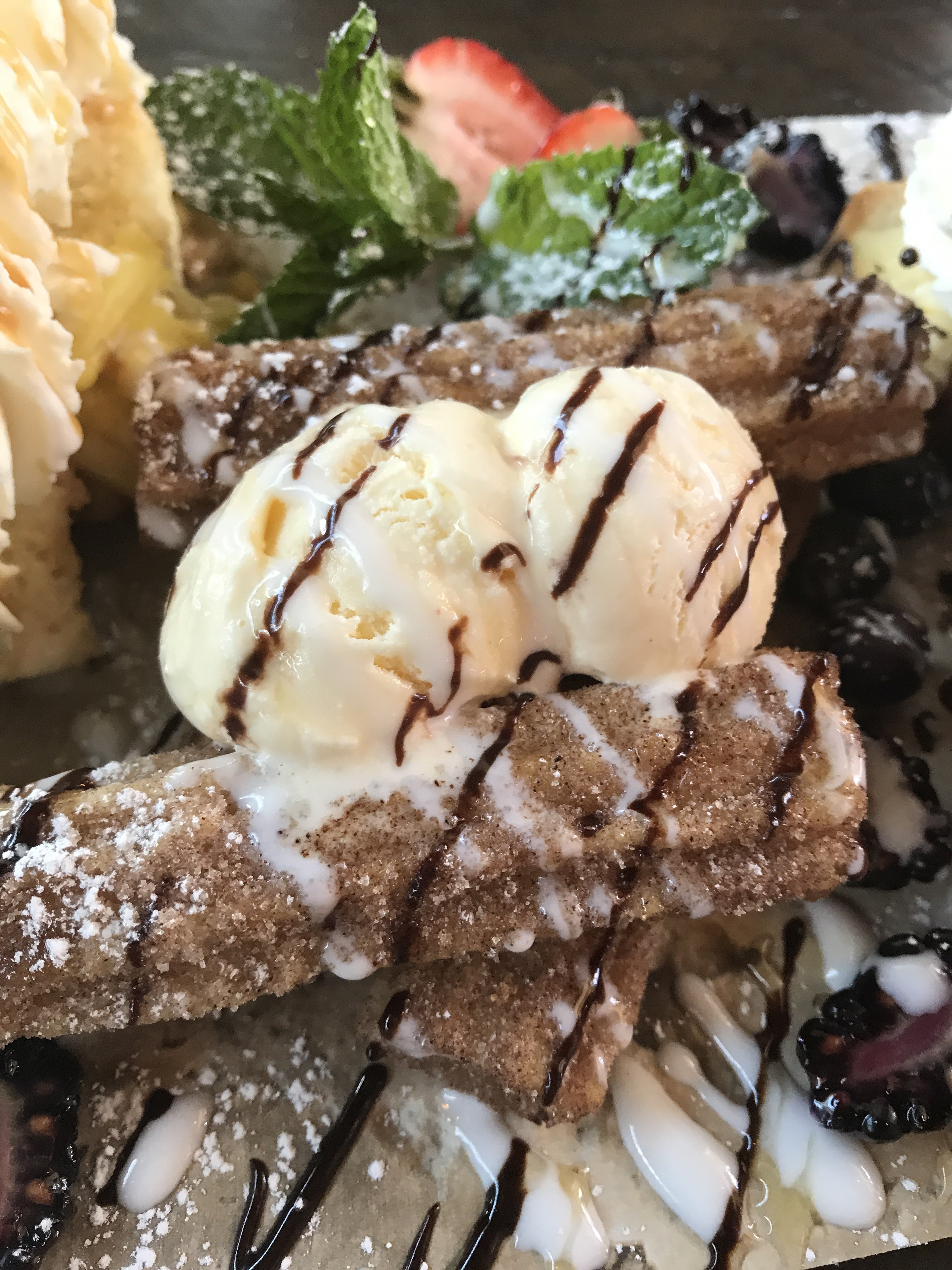 We certainly had to try the house-made Churros, garnished with dark and white chocolate, served with a side of vanilla ice cream. They’re made fresh each morning.